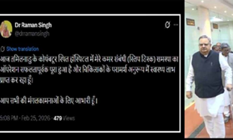 विधानसभा अध्यक्ष डॉ रमन सिंह का कोयंबटूर में स्लिप डिस्क का ऑपरेशन हुआ. डॉक्टर रमन सिंह का आपरेशन सफल रहा. खुद डॉक्टर रमन सिंह ने सोशल मीडिया साइट x पर पोस्ट कर इसकी जानकारी दी. (CG Vidhansabha Speaker) डॉ. रमन सिंह ने पोस्ट कर कहा कि “आज तमिलनाडु के कोयंबटूर स्थित हॉस्पिटल में मेरे कमर संबंधी (स्लिप डिस्क) समस्या का ऑपरेशन सफलतापूर्वक पूरा हुआ है और चिकित्सकों के परामर्श अनुरूप मैं स्वास्थ्य लाभ प्राप्त कर रहा हूँ.
