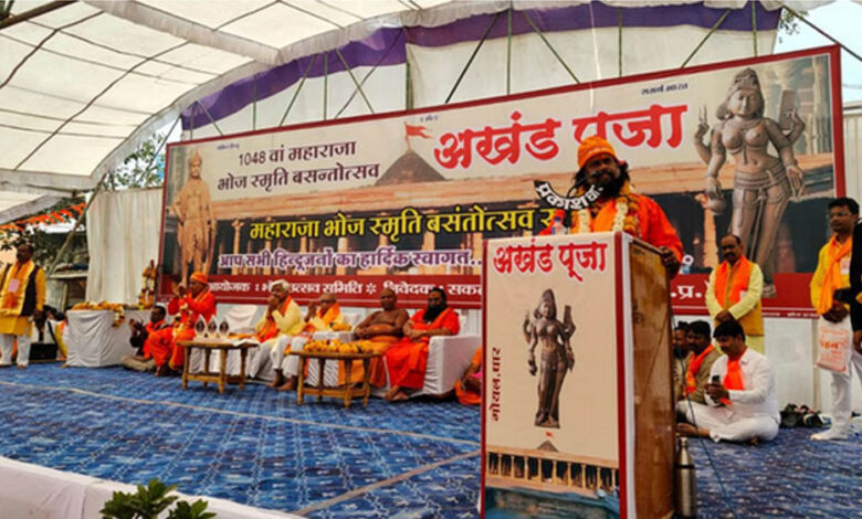 वसंत पंचमी के मौके पर राजा भोज वसंतोत्सव समिति ने शुक्रवार को यहां एक धर्मसभा का आयोजन किया। इस दौरान वक्ताओं ने कहा कि वर्ष 2034 में भोजशाला के निर्माण को एक हजार साल पूरे हो रहे हैं। इस बीच भोजशाला का मुकदमा हमें जीतना है और यहां मां सरस्वती के भव्य मंदिर का निर्माण करना है। विश्व हिंदू परिषद के राष्ट्रीय अध्यक्ष आलोक कुमार ने कहा कि लंदन के एक म्यूजियम में मां सरस्वती की मूर्ति है। उसे देश में वापस लाना है। भोजशाला मामले में जो याचिका लगी है उसका मुकदमा जीतना है।